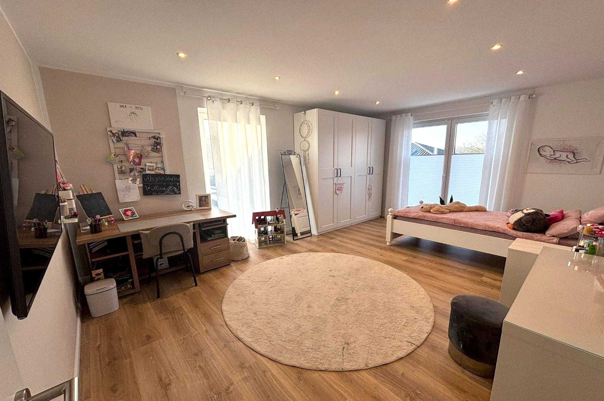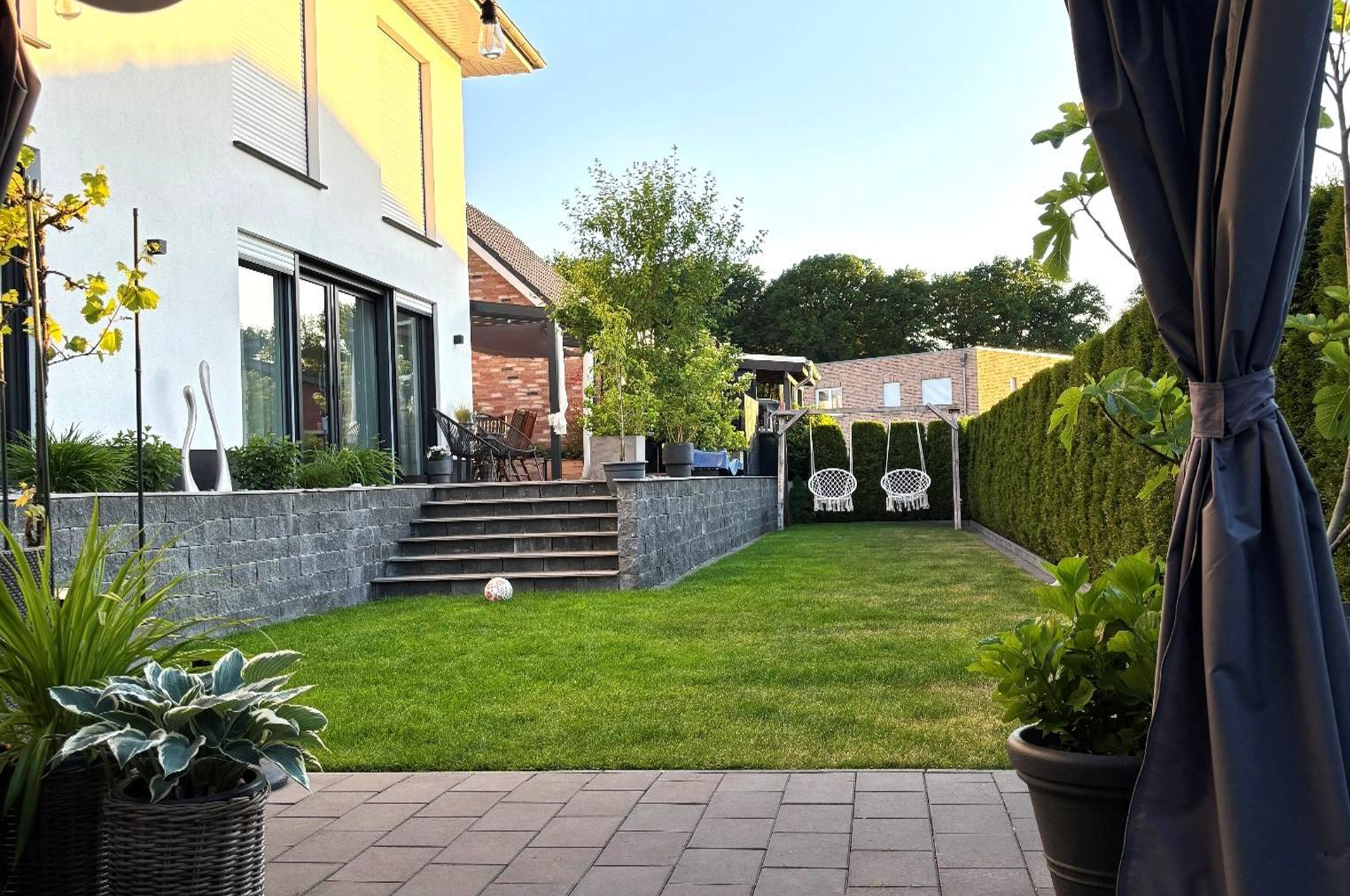 Das 608 m² große Eigentumsgrundstück ist ideal ausgerichtet, so dass Sie den ganzen Tag die Sonne im Garten genießen können. Eine Terrasse mit einer modernen Terrassenüberdachung schützt vor Regen und starker Sonne und bietet einen stilvollen Rückzugsort für entspannte Abende und gesellige Treffen. Der pflegeleichte Garten bietet Platz für schöne Stunden im Freien.